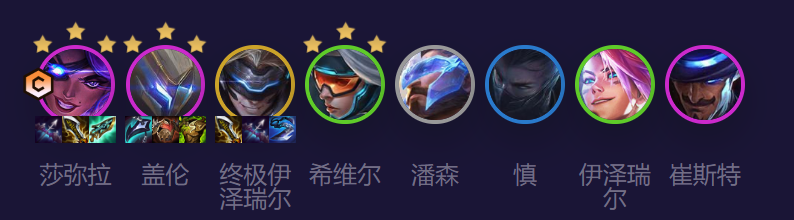 盖伦和莎弥拉分别是我们阵容的主坦和主C。作为4费卡,它们的基础属性在同阶段的棋子中相当优秀,属于T1级别存在。一般情况下,两星的盖伦和莎弥拉在后期能保持血量优势,让我们有机会保2争1。未来枪手阵容属于稳健型,在面对新崛起的怪兽联盟、高决斗、赌卡莎等高爆发阵容时也有一定优势。