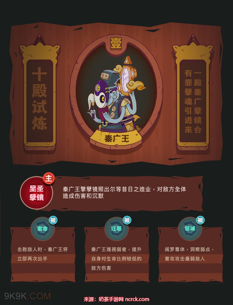 秦广王的技能相当棘手,他的大招可以造成全体伤害并沉默,1技能击杀敌人还能刷新攻击冷却时间,2技能会对生命值最低的敌人造成额外的伤害加成,而3技能的普通攻击则专注打击攻击最低的目标。