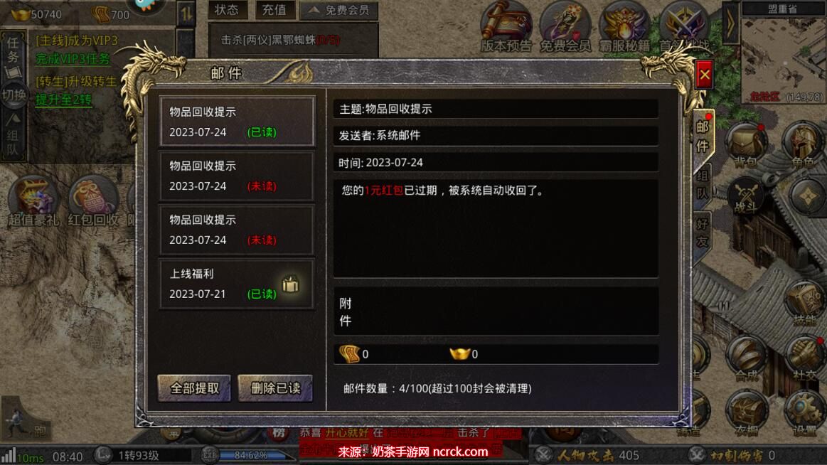 6、进入“邮件”界面,点击“全部提取”即可领取兑换码奖励。