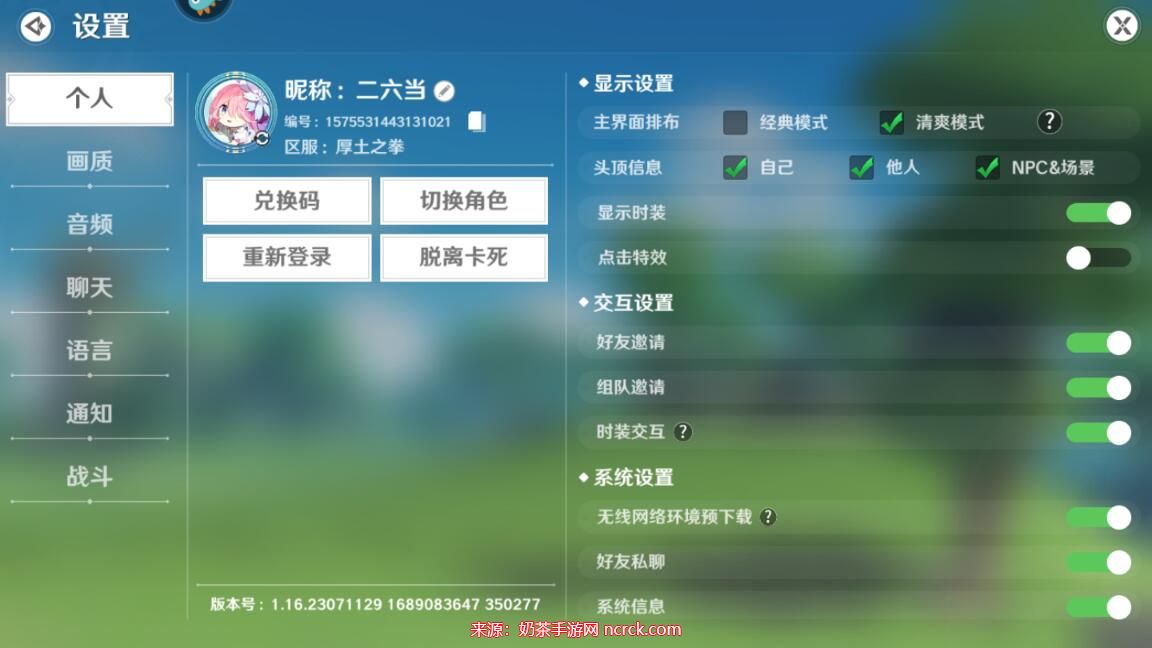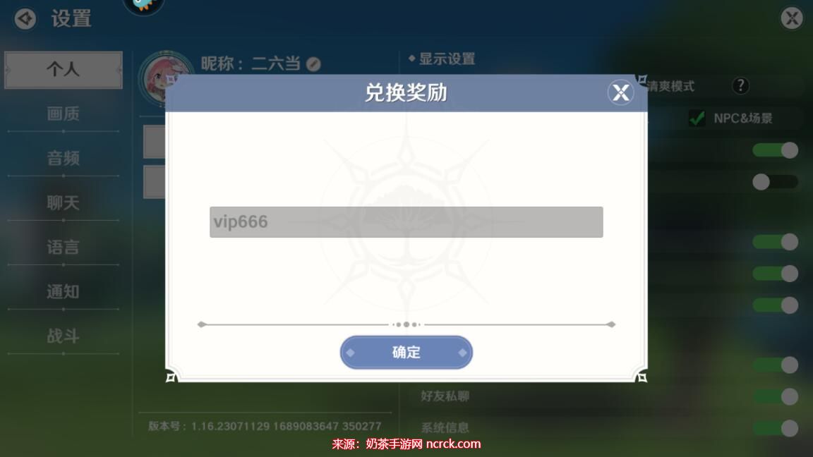 3、在游戏设置中,进入个人选项,你将会找到“兑换码”按钮。