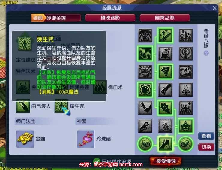 【妙谛金莲】流派新增了【焕生咒】技能,可以汲取“所有满血队友”30点生命值,临时提升治疗能力。然而,该技能的使用空间相对较小,因为只有满血队友才能被汲取,且需要浪费一回合的治疗时间。除非开场使用,否则效果有限。