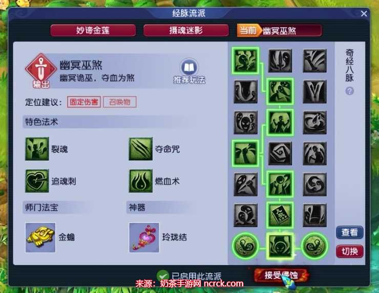 【幽冥巫煞】流派的无底洞经脉点法和此前一样,选用【1221221】即可。然而,值得注意的是,无底洞拥有一个相当不错的侵蚀技能。