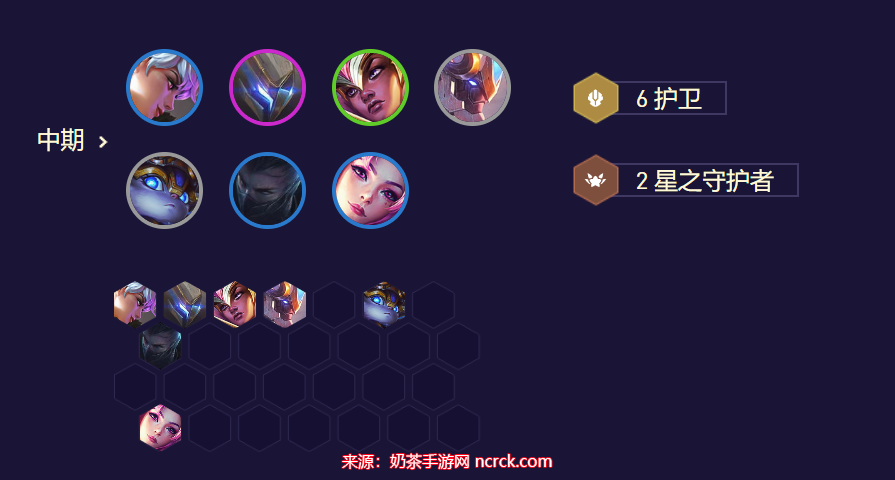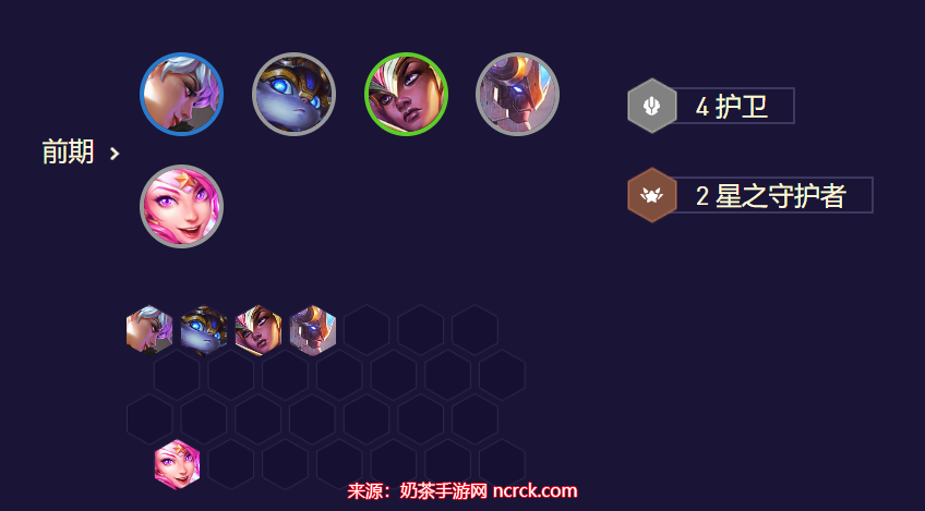 开局人口节奏:2-1升级到四级,2-5升级到五级,3-2升级到六级。前期使用4护卫加2星之守护者进行过渡。这样的过渡既流畅又经济实惠。