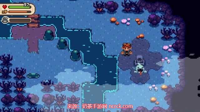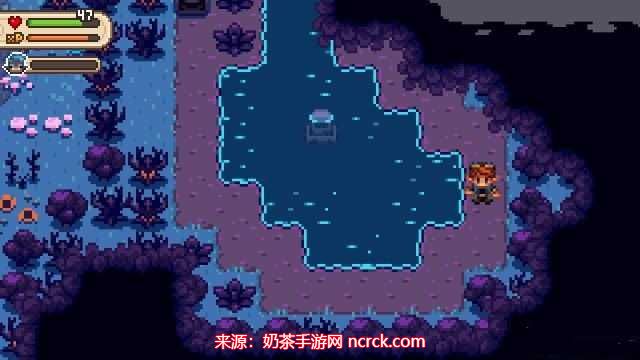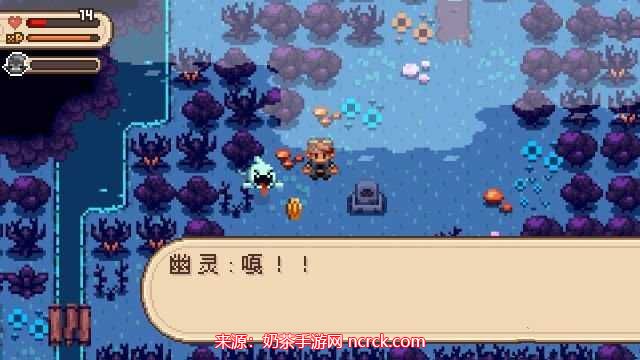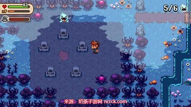 在东边,你会来到森林的边界,但是发现无法出去。别担心,往下走,你会发现一个有五个墓碑的地点。在这里,你需要使用锤子同时震荡五个墓碑,这样第四只幽灵就会弹出来。然而,周围会有喷火的花怪苏醒,务必先清理花怪再对付幽灵。