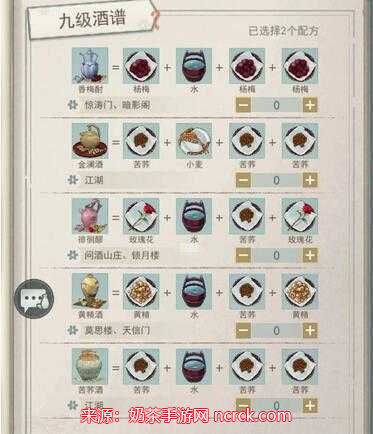 2、九酿古酒:桃花+桃花+稻谷+水,归属:烧酒。