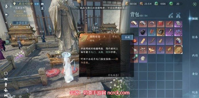 现在你已经收集到了【阴阳密卷·上】和【阴阳密卷·下】,接下来需要进行合成。打开你的背包,点击合成,将两个密卷合成为平天门信物——【阴阳密卷】。