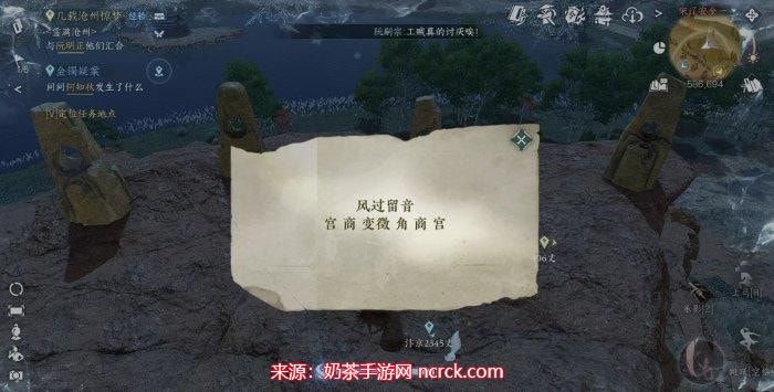 按照顺序对石块依次使用技能【风起云涌】,顺序为“变徵(zhi)”——“徵”——“变徵”——“角”——“商”。请确保从石块的正面吹气,不要在背面使用,否则会判定为错误。