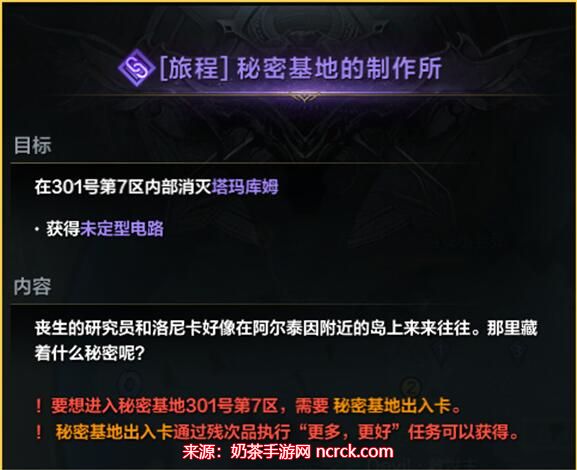 前往阿尔泰因门口的秘密基地301号完成任务,然后接黄色任务“紧锁的门”获得副本门票。