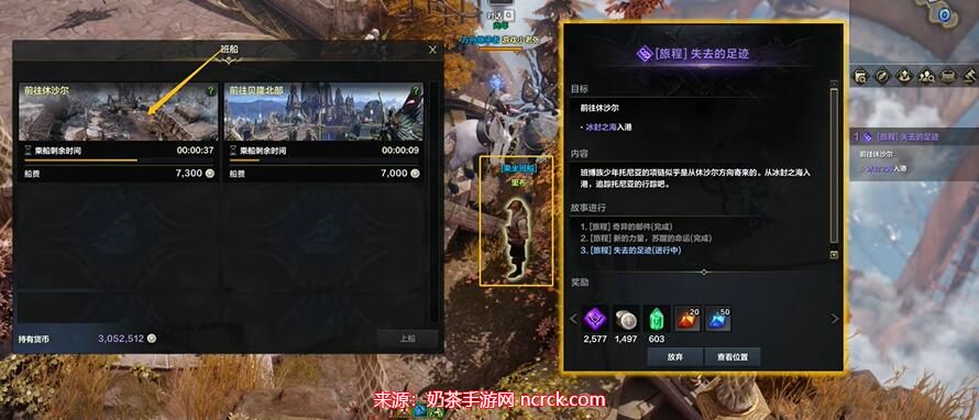 进行第三条任务线,接取“失去的足迹”,坐船前往修沙尔并完成后续任务。