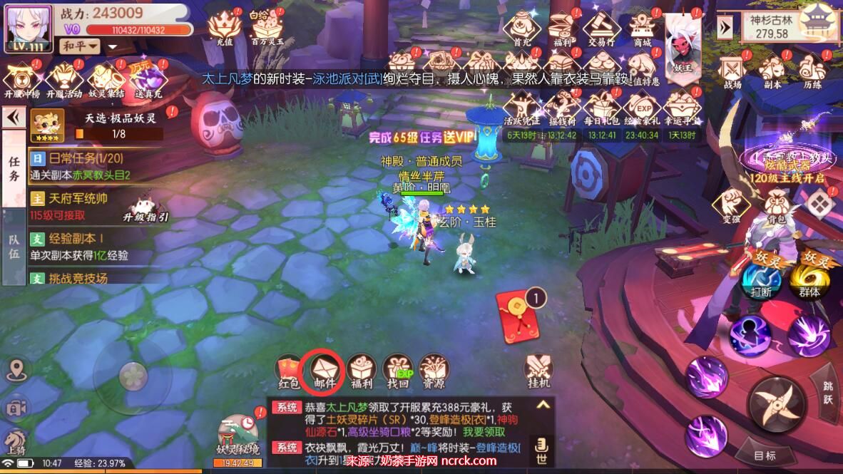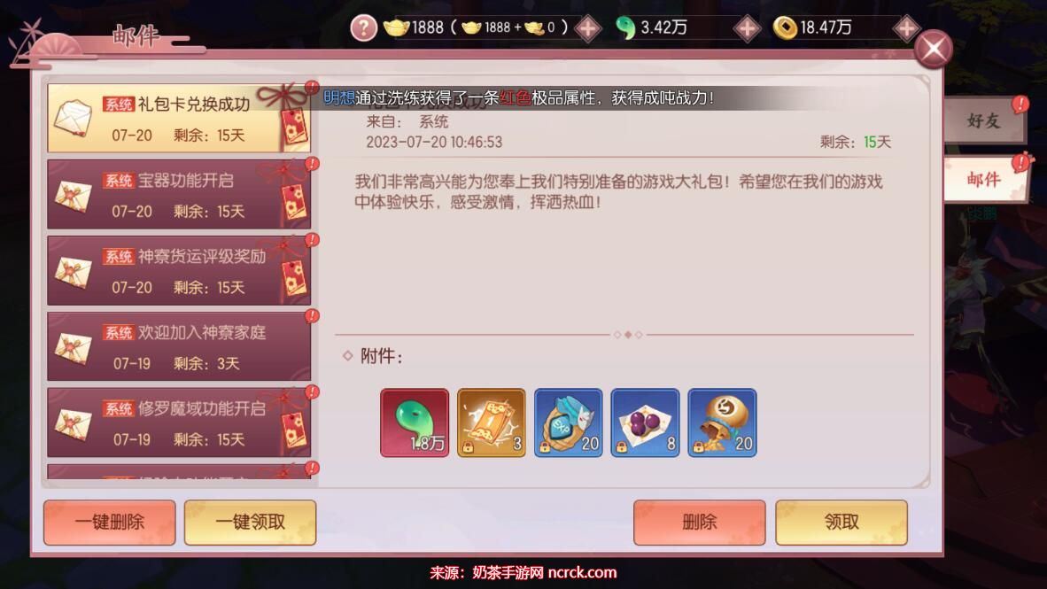 5、成功兑换后,你将收到领取奖励的提示。然后返回游戏界面,在屏幕下方找到邮件图标。进入邮件界面,你将看到礼包卡兑换成功的内容。