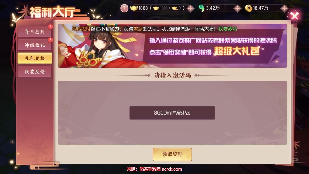 4、在获取到兑换码后,回到福利兑换界面,输入你获得的激活码。确保输入无误后,点击确认兑换。