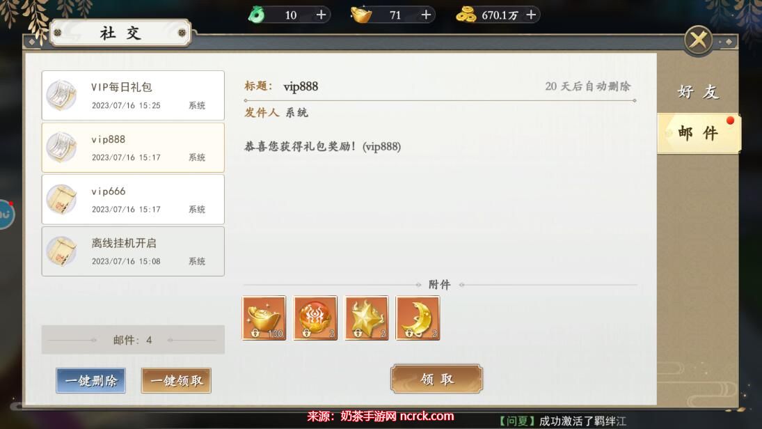 6、在邮箱中,您将看到通过兑换码获得的奖励,包括元宝和培养道具等。点击一键领取即可。