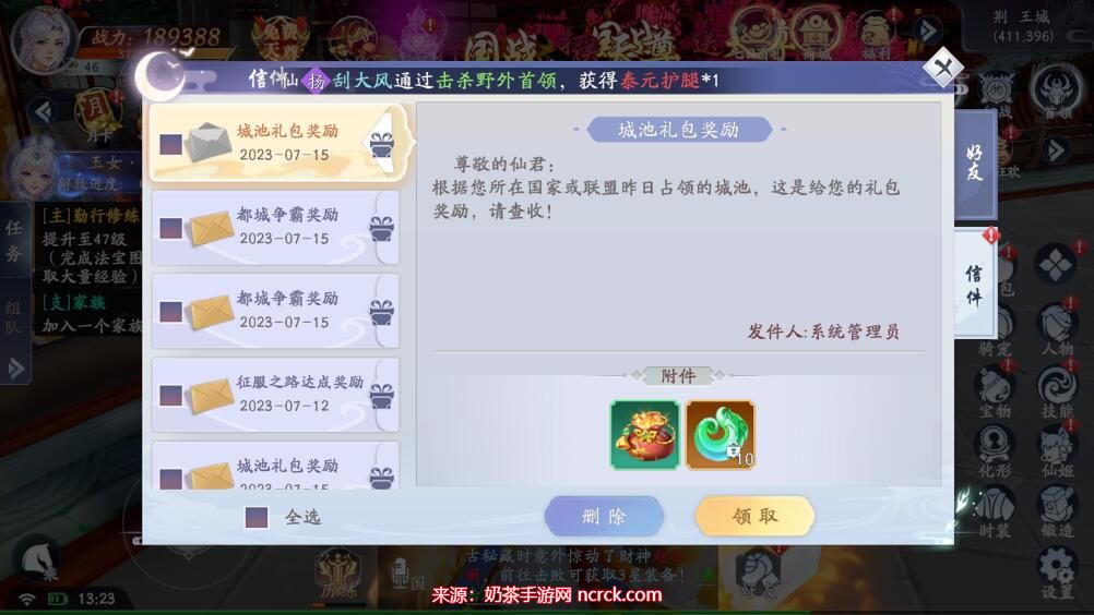 5、进入好友系统后,点击信件选项,如下图所示,点击领取按钮即可获得兑换码奖励。