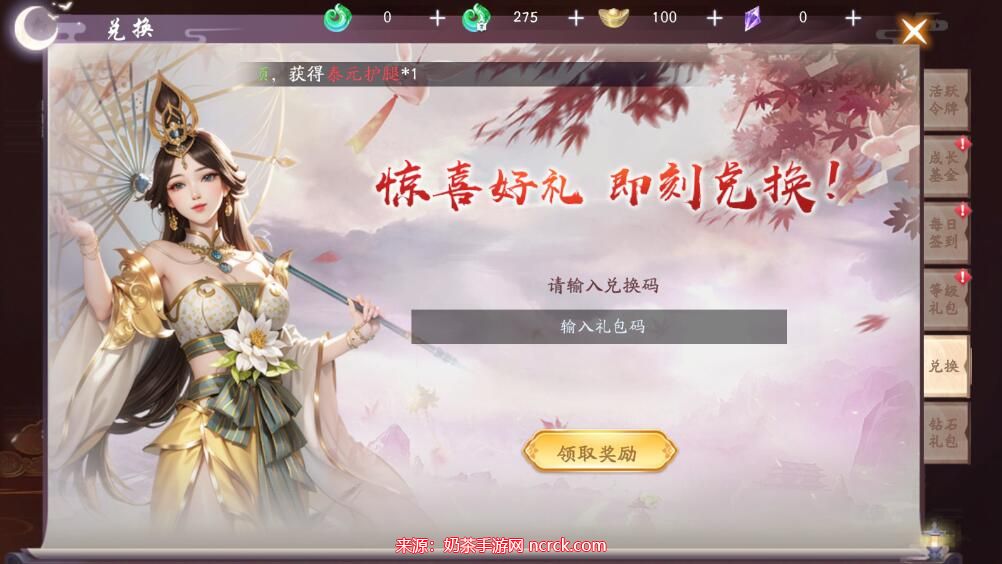 3、点击兑换按钮后,输入你所获得的兑换码,然后点击领取奖励。