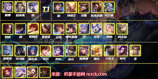 T2:韩信、夏侯惇、云缨、娜可露露、铠、梦奇、嫦娥、阿古朵;