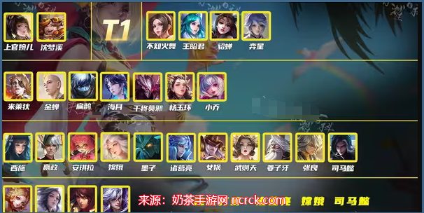 T1:上官婉儿、沈梦溪、不知火舞、王昭君、奕星;
