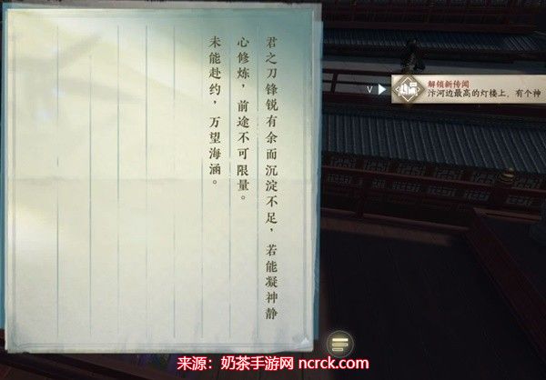 直接打开箱子,获得一个线索,该线索与江湖技能"镜天照影"相关。前往塔上与相关NPC对话并完成相应小游戏。