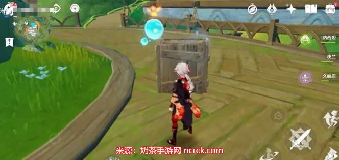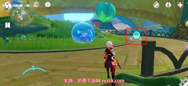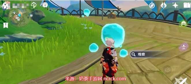 1、通过寄想者剧场锚点传送,来到寄想者剧场附近,有四个小水珠和一个水泡宝箱,靠近宝箱右侧第一个小水珠选择“观察”;