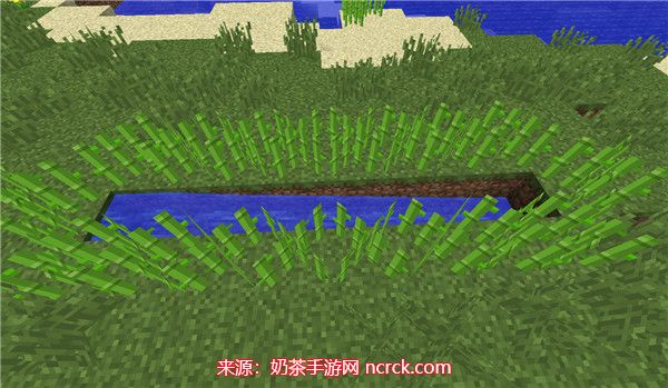 在一个水源方块旁边挖一条沟渠,如下图所示: