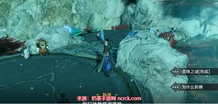 继续前进,你会发现水中有一些光点。前往474,131处,进行调查,你将会发现一个破损的灵珠。