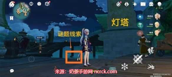 找到公告栏位置并调查。在须弥城中,来到公告栏位置,仔细调查。你会看到一道谜语:“与白昼交班的白昼,从桥上能看见灯塔匆匆下班的背影。”记住这个谜语。