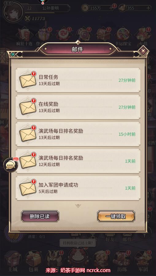 4、点击领取奖励后返回主城,点击右下角的邮件图标。