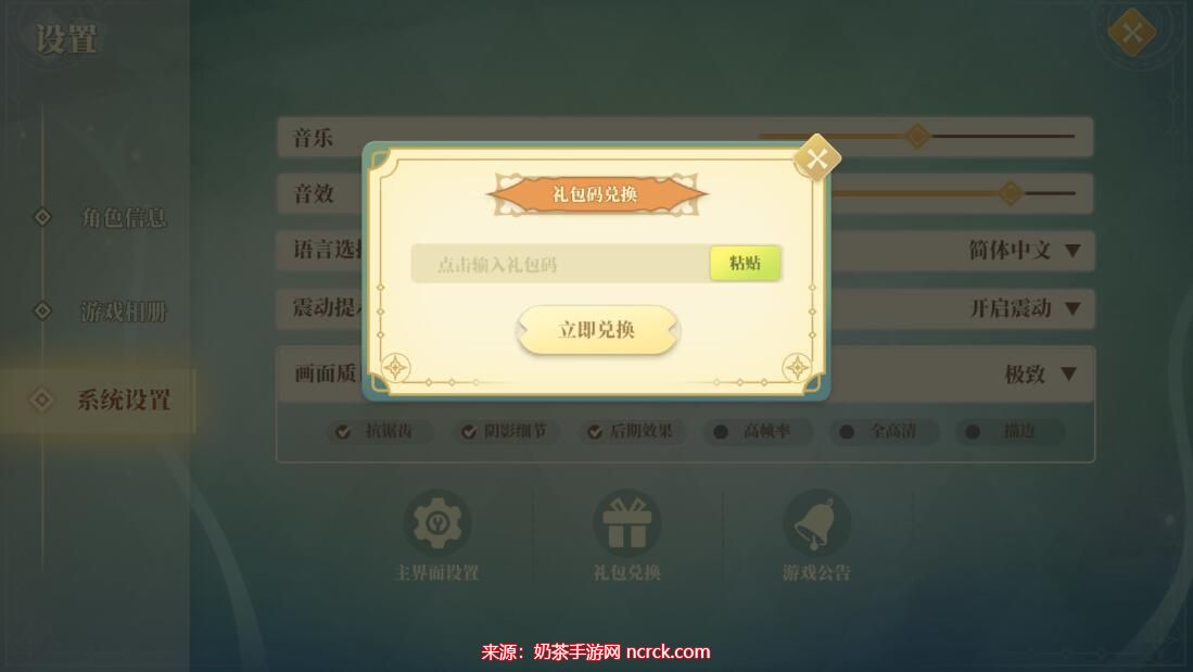 3、在系统设置界面中,你将看到一个名为"礼包兑换"的按钮,点击它。