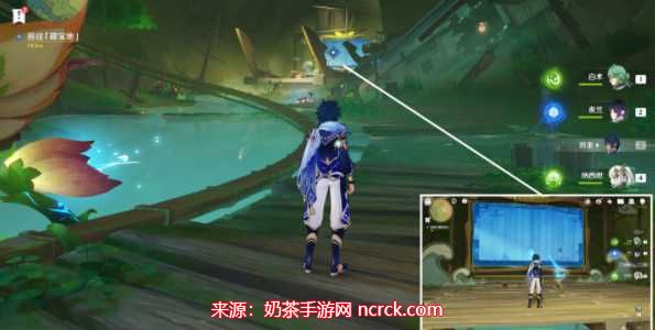 完成躲避炮弹游戏后,返回喇叭处,发射炮弹击碎石壁。跟随任务指引,深入洞窟,前往奶茶地。