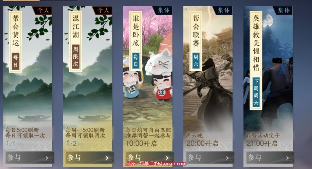 周常活动:包括混江湖、帮会联赛和英雄救美等活动,这些活动需要帮会成员集体参与,通过团队合作来取得胜利。