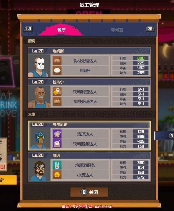 此外,拉乌尔也是必备的厨师,因为他的存在能够使饮料的售价更高。其他三个厨师的料理值将直接影响到你的收益,因此也需要谨慎选择。
