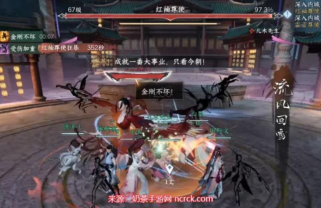 跳舞机制 当红袖尊使的血量降至90%、50%和10%时,她会邀请众人跳舞。被邀请的玩家需要点击屏幕上的图标来跟随红袖尊使的跳舞动作,而没被邀请的玩家则应优先击败红袖尊使召唤的伴舞。