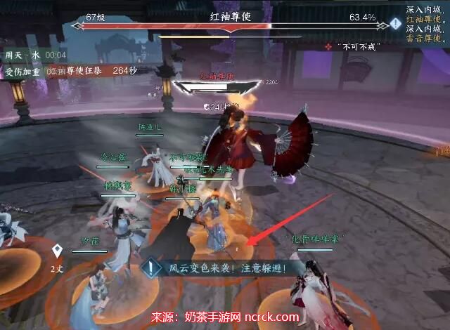 技能风云变色 在战斗中,红袖尊使会释放风云变色技能。玩家会看到脚下出现明显的指示,及时躲避,否则可能会被红色小旋风吹起来。