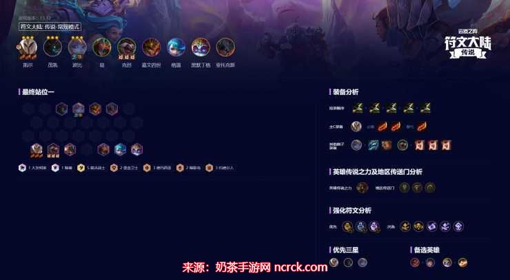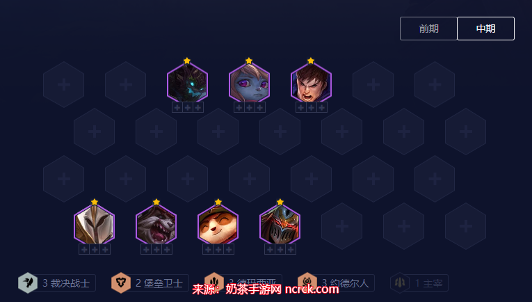 羁绊组成:5裁决战士3德玛西亚3约德尔2堡垒战士2暗影岛