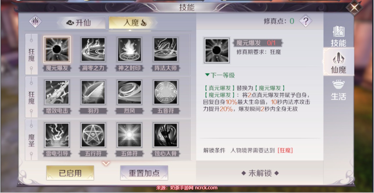 仙魔技能是在原有技能的基础上消耗修真点数来升仙或入魔的效果。开启仙魔后,你可以加强原有技能,通常是增加自身增益或强化技能效果。如果你的等级和战力已经达到顶峰(虽然很难),或者你因为生存压力想要迅速提高实力,你可以选择升仙或入魔。然而,变强是需要付出代价的。除了升级所需的仙魔点数外,你还需要收集一系列学习资料,几乎每种技能的仙魔化都需要消耗技能书等材料,这些材料可以通过修真副本和五行之序获得。