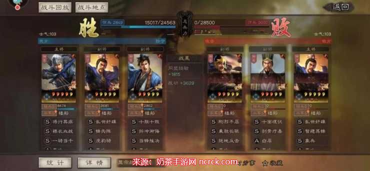 分析:这是一个当前版本中的顶级阵容之一,即使曹操没有奸雄,依然强大。曹操可以增加队伍中突击战法的发动几率,并提供两回合的先手。张辽破防,夏侯渊输出极致,从而取得胜利。