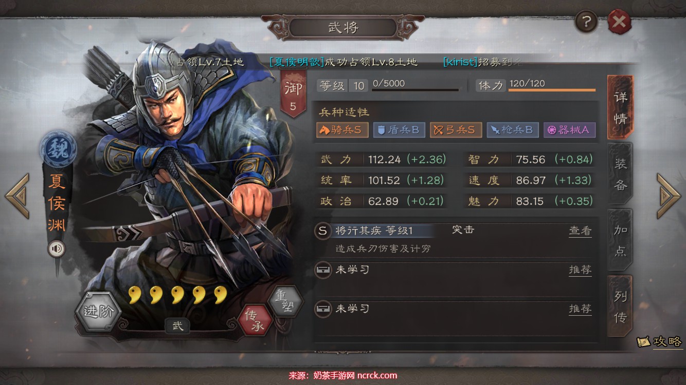 加点推荐:建议将夏侯渊的属性点全部加在武力上,以提升他的输出能力。