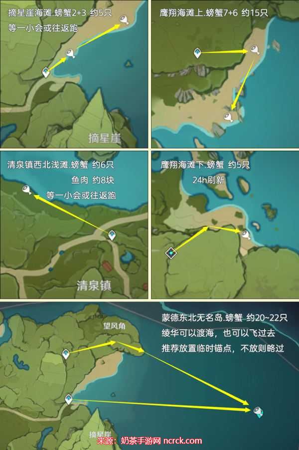 鹰翔海滩下:这个地点有5个螃蟹,但刷新时间较长,需要等待24个小时。