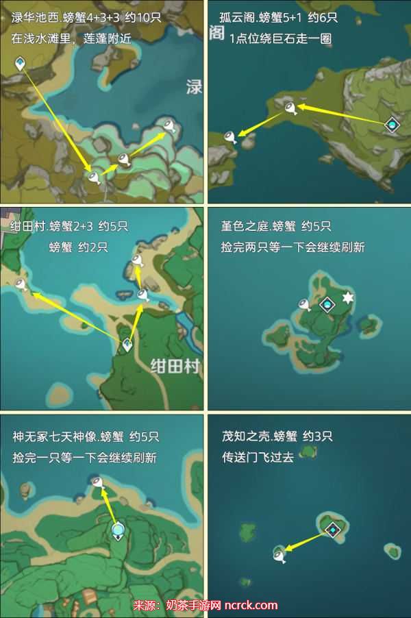绀田村:这里有7只螃蟹,您可以按照指定的路线采集。
