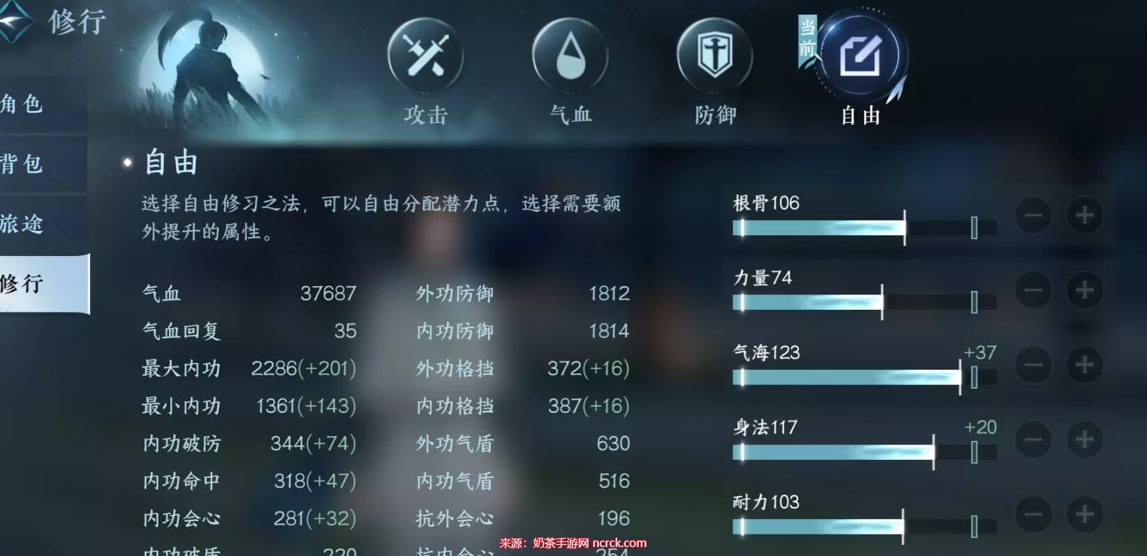 (7)建议输出角色调整修行加点,优先提升气海和身法以增加伤害。由于有铁衣负责承受BOSS的伤害,输出角色无需过于注重坦度。