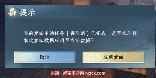 16、应用梦回:对话结束后,选择应用梦回,你将被传送出去,这次你将获得善恶断·白。