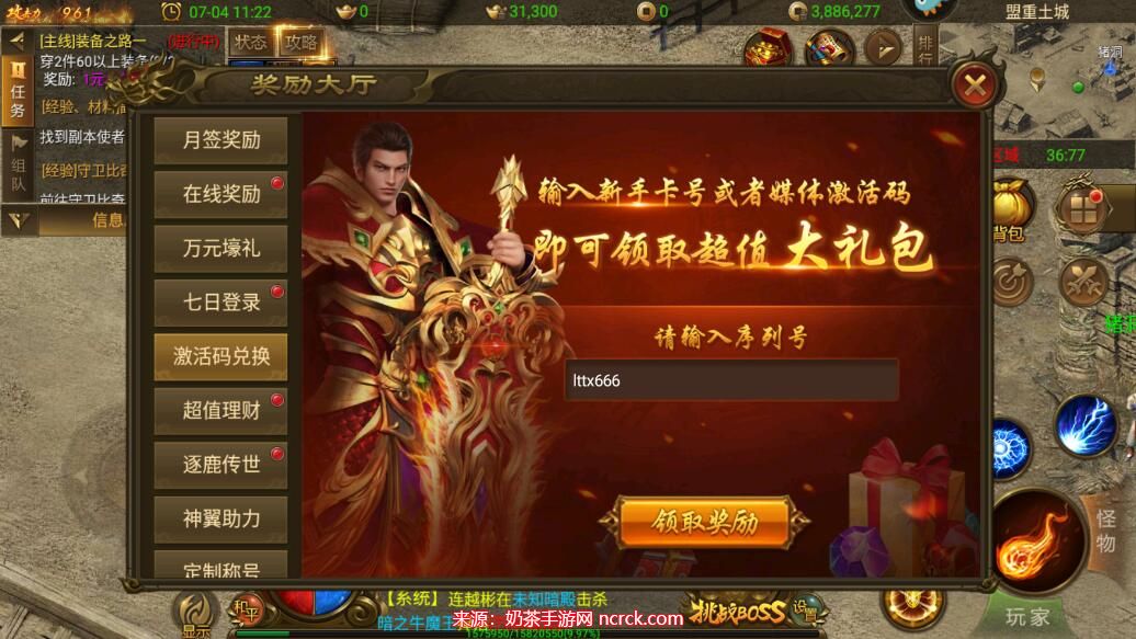 4、在激活码兑换页面,将复制或输入上述提供的激活码,并点击“领取奖励”。