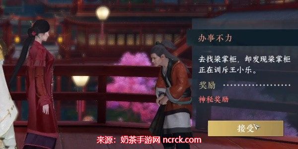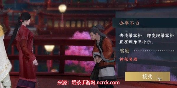 完成询问后,梁婆娘和王小乐将再次对话,您再次接取任务。