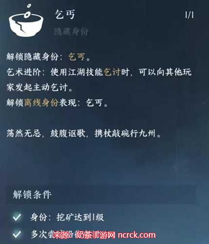 成功乞讨一次后,你将解锁“乞丐”身份(在身份-挖矿中查看)。