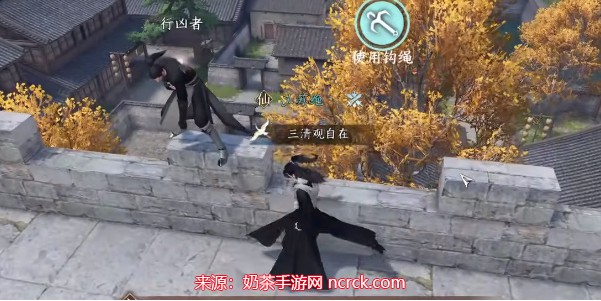3、如果追捕失败,别灰心,你可以提前跑到城墙上,堵住行凶者的去路,并在他靠近时使用点穴技能,这样能大大增加成功的几率。首先,我们要先飞到位于行凶者背后的房屋上。