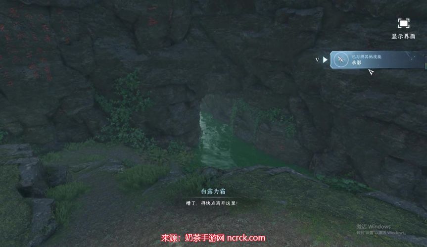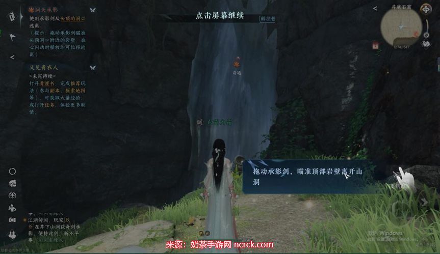 右下角拖动承影剑,转动视角瞄准顶部岩壁离开山洞