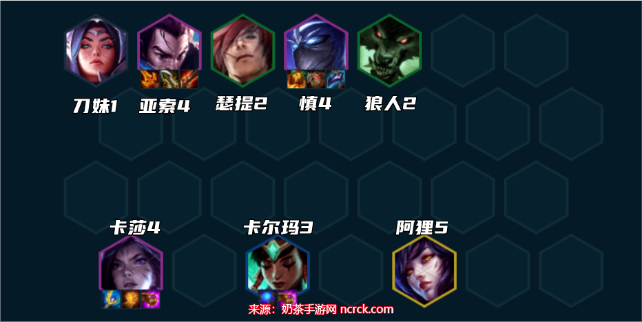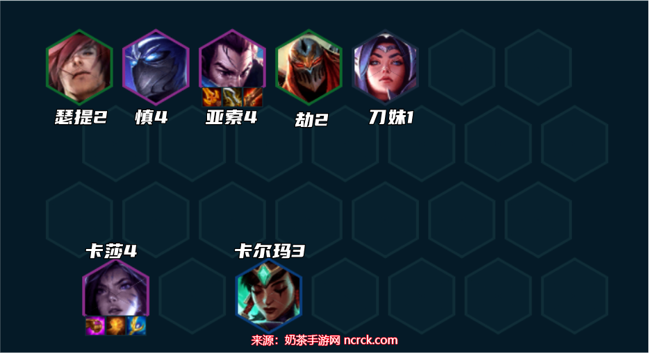 7、当卡莎或亚索中的任意一个达到2星时,可以考虑升级至8人口。8人口时,补上狼人并搭配开启4挑战者羁绊。然后,缓慢升级至4费卡的2星状态,如果没有狐狸,可以用劫来替代。卡莎和亚索的装备神装完成后,优先为慎选择肉装备。如果有多余的装备可以给卡尔玛,也可以考虑将其升至3星,配合亚索的秒杀后排效果非常不错。