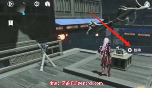 5、寻找机关:进入大门后,前方会有一个机关。点击拉动按钮。