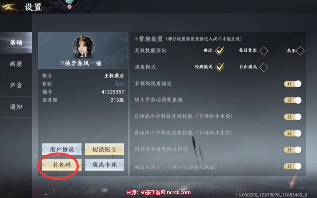 3、进入游戏的设置界面后,向下滑动,找到"礼包码"选项。