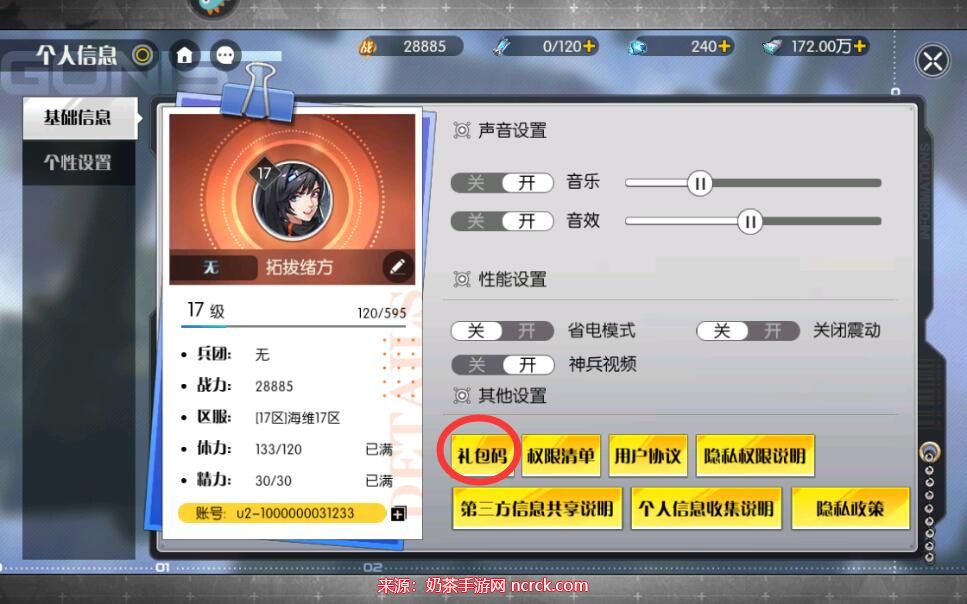4、在设置页面的下方,您会找到一个名为"礼包码"的按钮。请点击该按钮。
