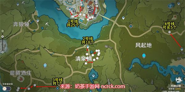 根据地图上的标记,蒙德城中有25个慕风蘑菇刷新点,清泉镇有18个刷新点,风起地右侧的传送点附近可购买5个慕风蘑菇,最后在晨曦酒庄附近可以采集到7个蘑菇。